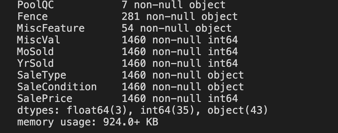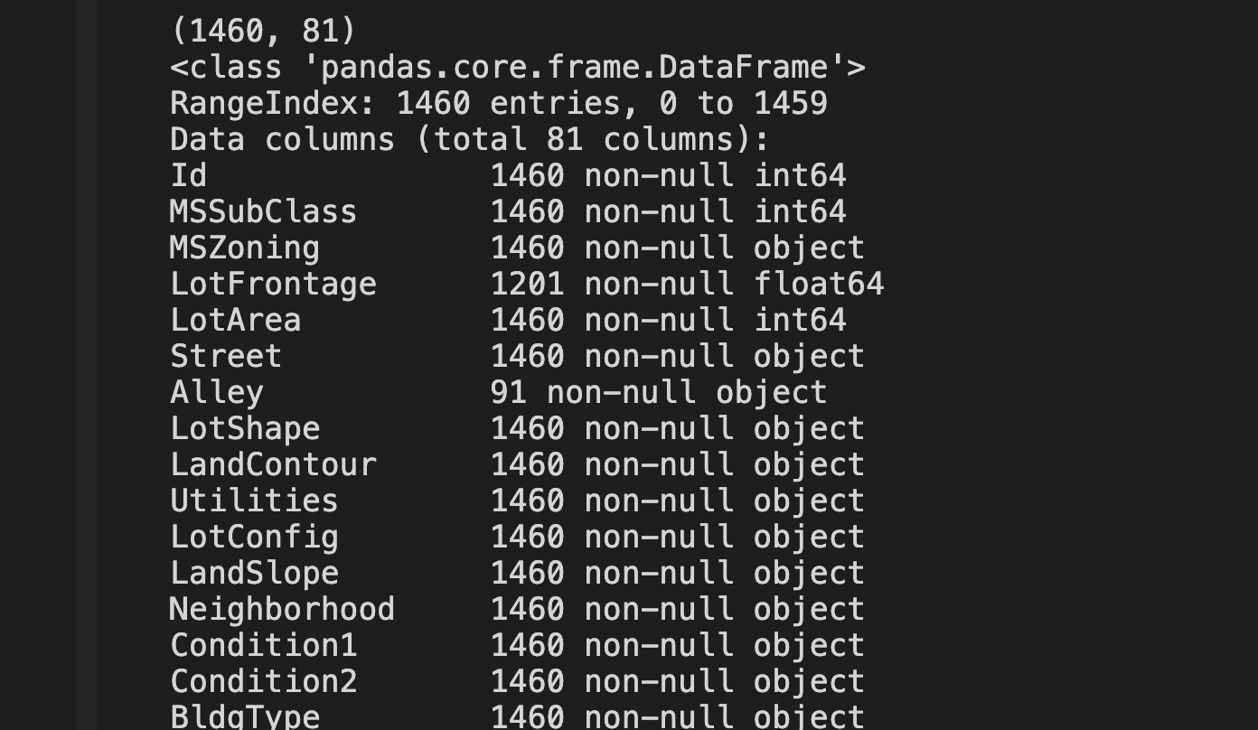 这里只截取了部分,可以看到训练数据是有1460条的,LotFrontage有1201个非空值,属于部分缺失,Alley这个数据只有91条非空值,属于严重缺失数据。有了这些信息,我们便可以进行处理了: