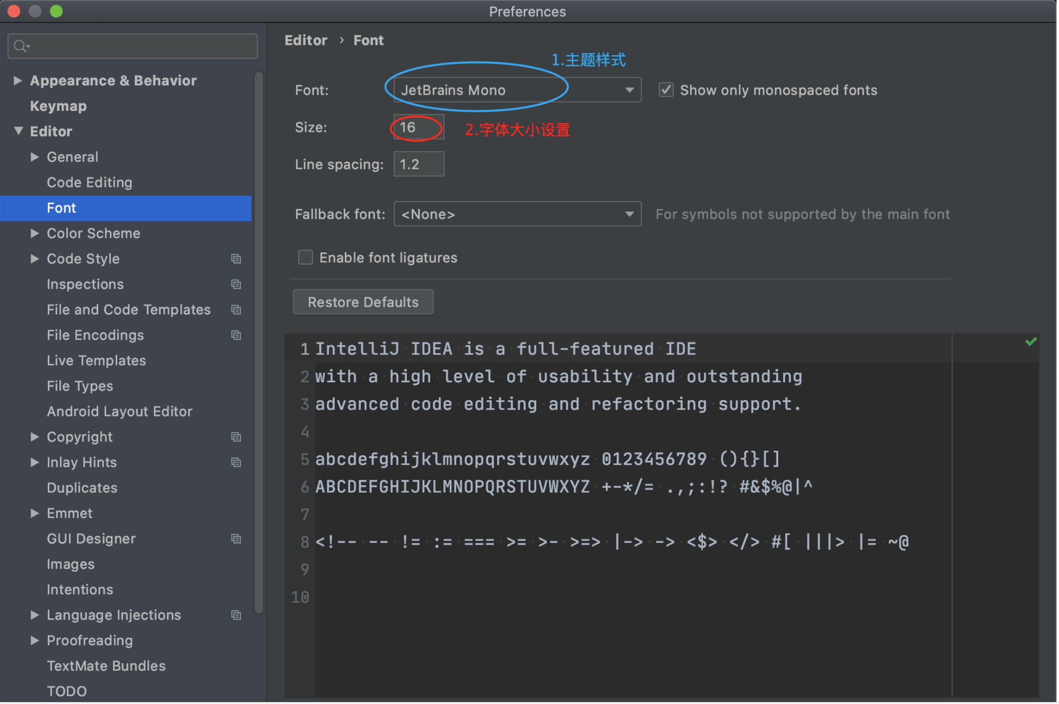 1.在设置中找到Editor,打开折叠找到Font进行调整