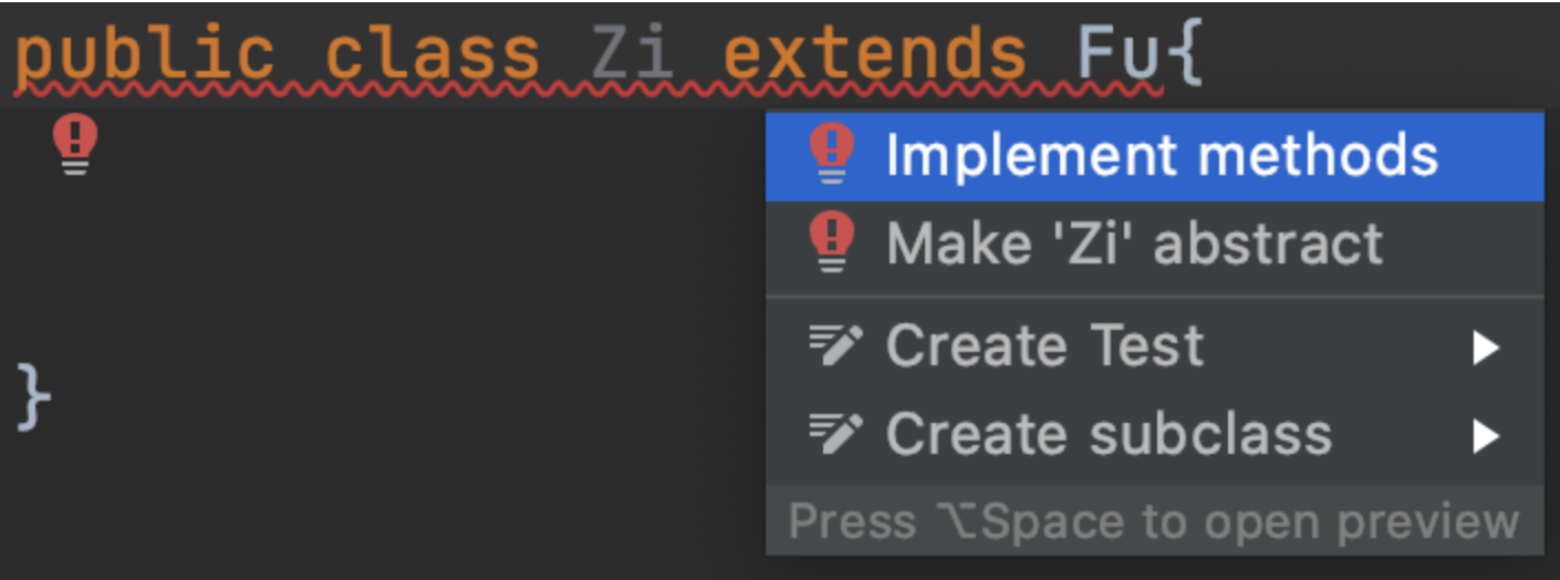 将鼠标放在子类红线处,win按alt+回车,mac按option+回车,点击第一个implement methods